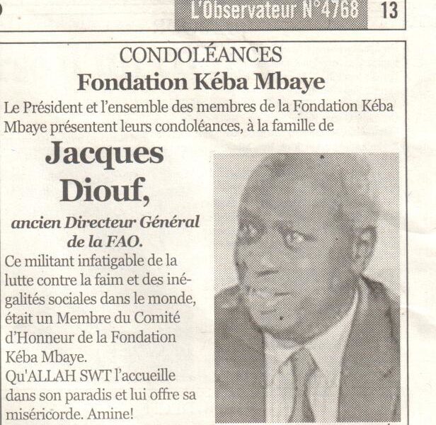 Condoléances Jacques Diouf Condoléances Jacques Diouf